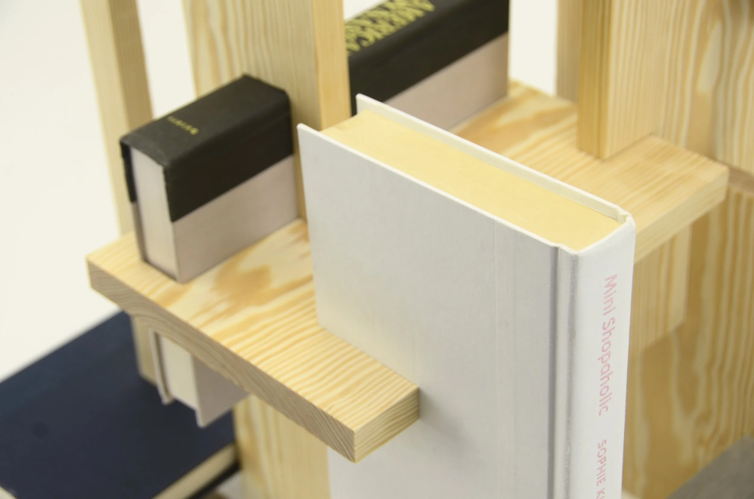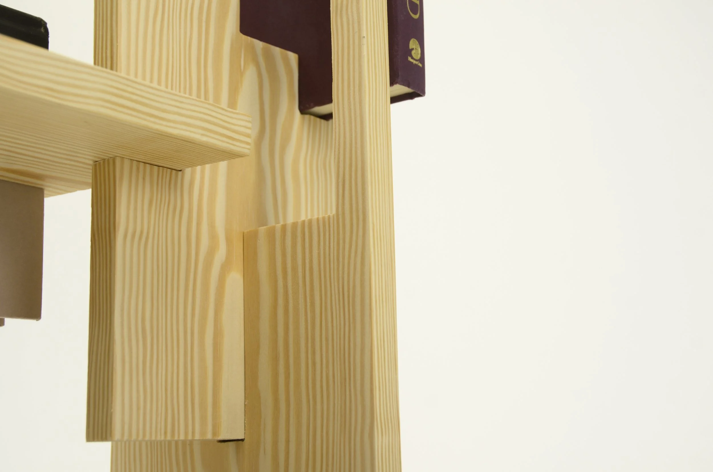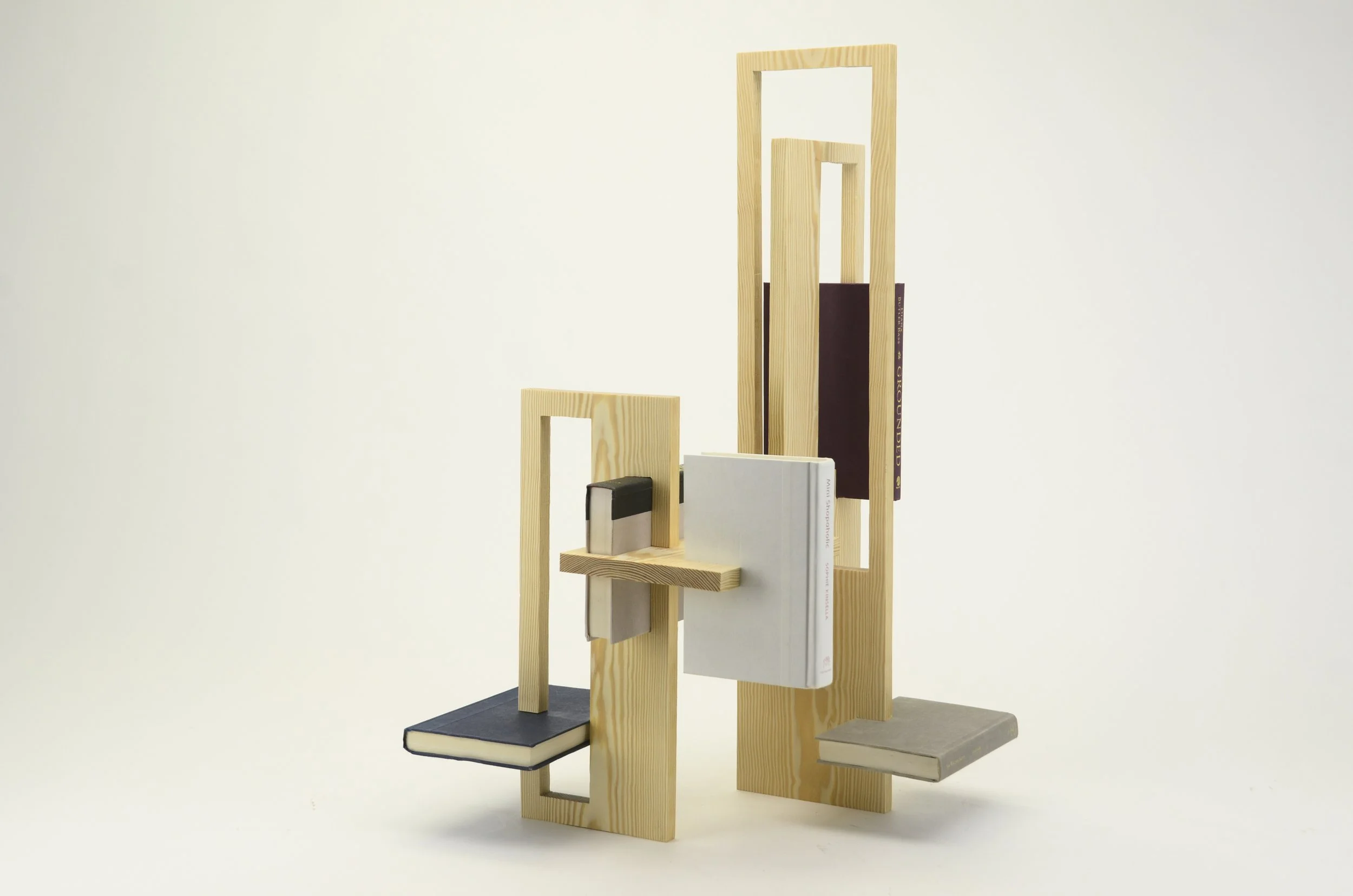 This assignment was one of designing within constraints while simultaneously creating a structure that creates a visually balanced three-dimensional wooden form showcasing planar surfaces and books arranged in a pleasing way.